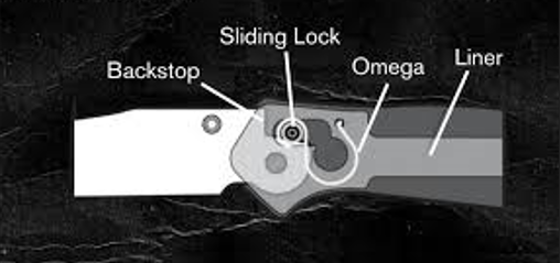 DE WERKING VAN DE CROSSBAR LOCK: Het Crossbar Lock vergrendelsysteem bestaat uit een gehard stalen vergrendel-as met twee integrale slipvaste geribbelde duimknopen (links/ rechts). Die vergrendel-as kan in een horizontaal kort sleufsysteem in de montageplaten /Liners van links naar recht bewegen. De beginsituatie van de Crossbar Loch met gesloten lemmet is linksvoor in die horizontale sleuf. De vergrendel-as wordt bij het geopende lemmet onder veerdruk van twee zogenaamde Omega-veren, die zich in de ruimtes onder de greep platen bevinden, naar links en naar voren en daardoor boven de korte lemmettang geduwd, waardoor het geopende lemmet zeer solide vergrendeld wordt. Mocht een Omega-veer toch breken kan de tweede het vergrendelen overnemen!