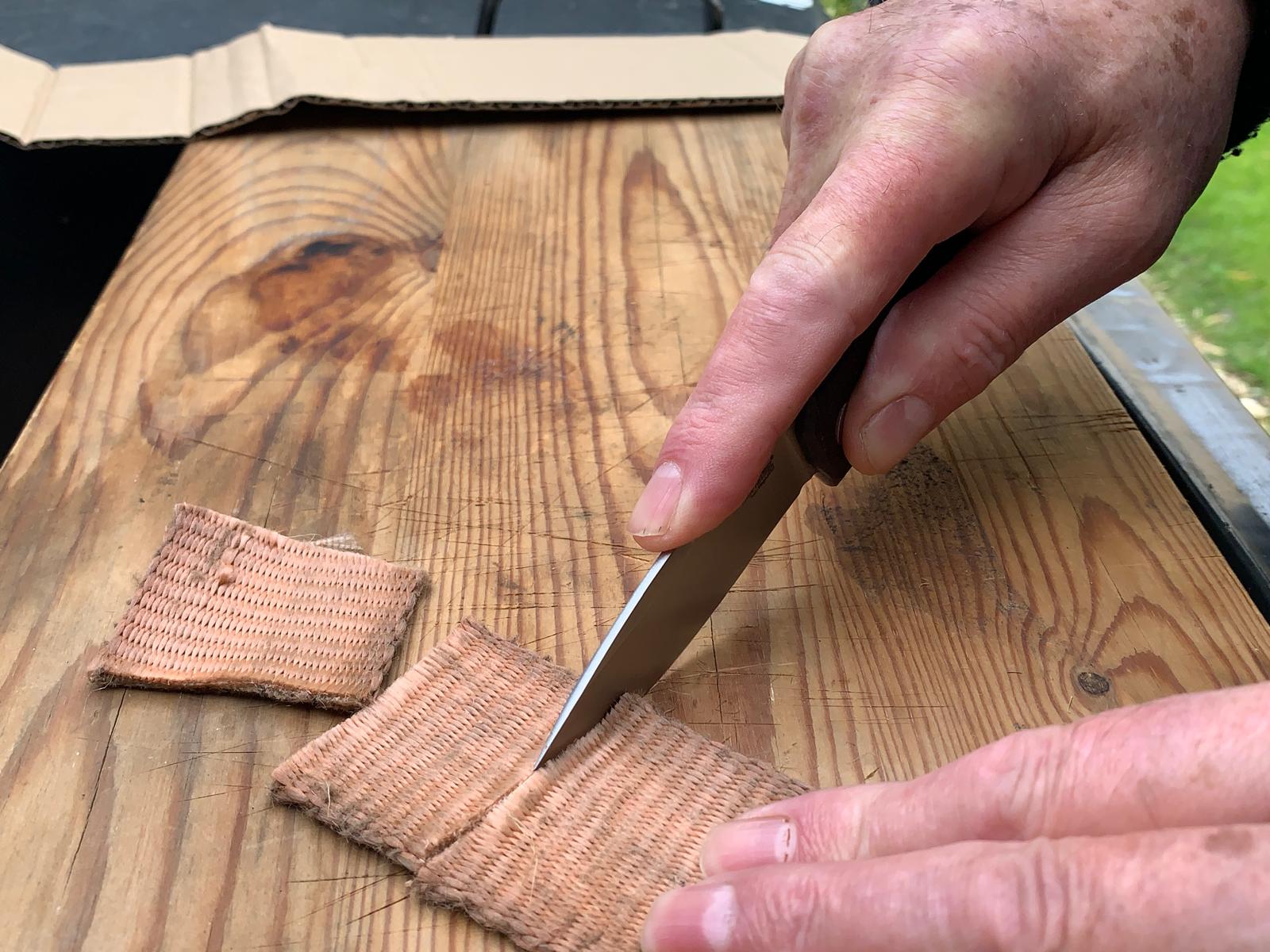 HET DOORSNIJDEN VAN DE BREDE NYLON TILBAND: Uitmuntend goed/.
