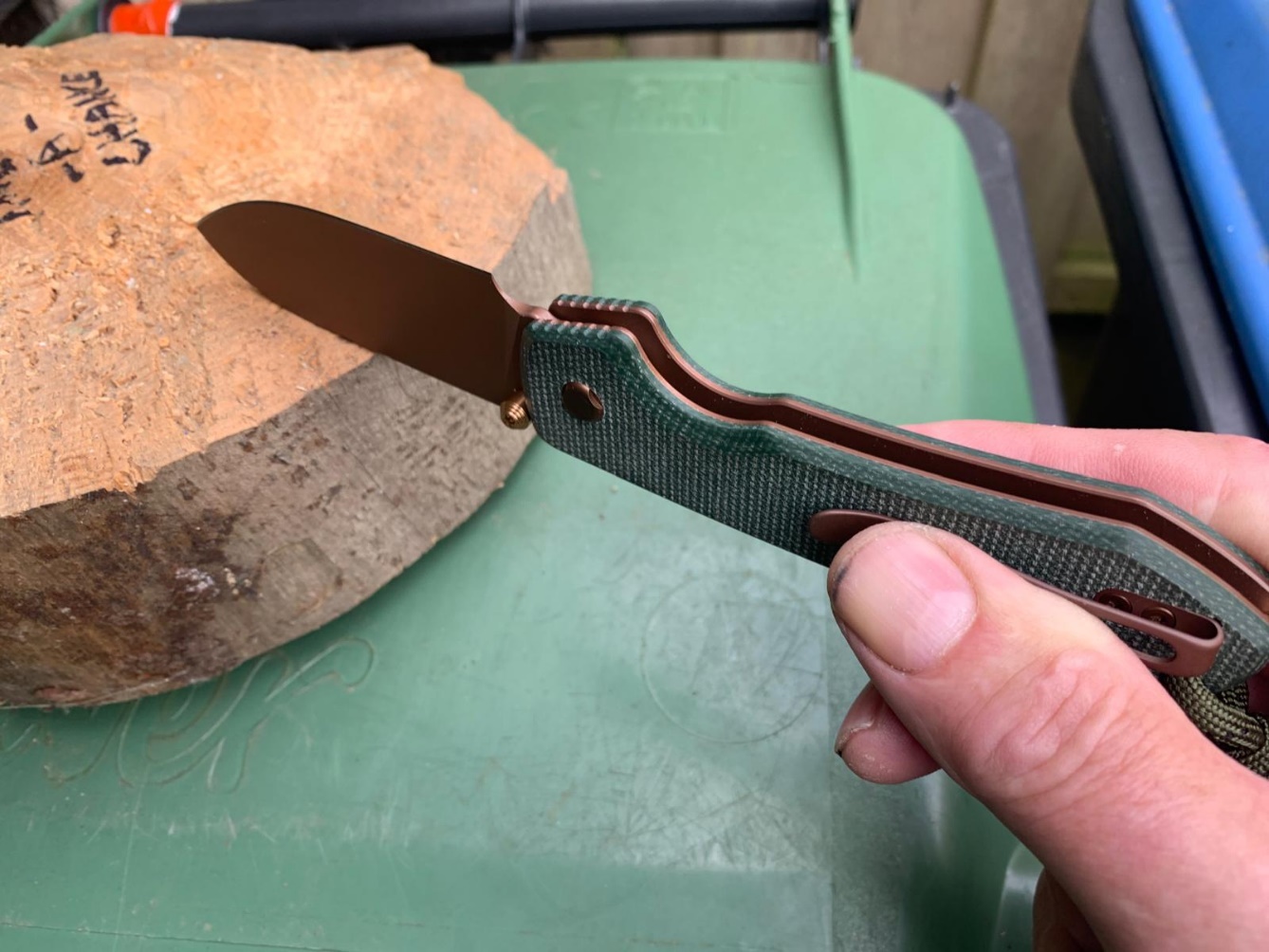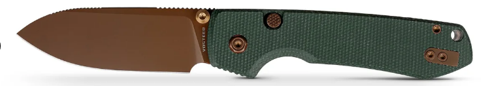 DE HANDGREEP: De handgreep bestaat uit de twee groene Micarta greep platen, die met behulp van Torx-schroefjes op de duinkoperkleurige roestvaste montageplaten/Liners zijn geschroefd. Tussen deze montageplaten/Liners zit de achterkant de rose goudkleurig geribbeld aluminium achter tussenstuk/Backspacer en de handgreep is voor een betere lemmetsturing aan de voor/ onderkant van ribbels/Jimping voorzien. De linker greep plaat herbergt Top Liner lock vergrendelsysteem en een afdekplaatje van de kledingclip. De handgreep heeft om verlies te voorkomen een oog voor een parakoord polsriem.