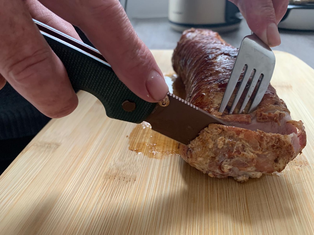 HET GEBRADEN VLEES AAN HET SNIJDEN: Uitmuntend goed/.